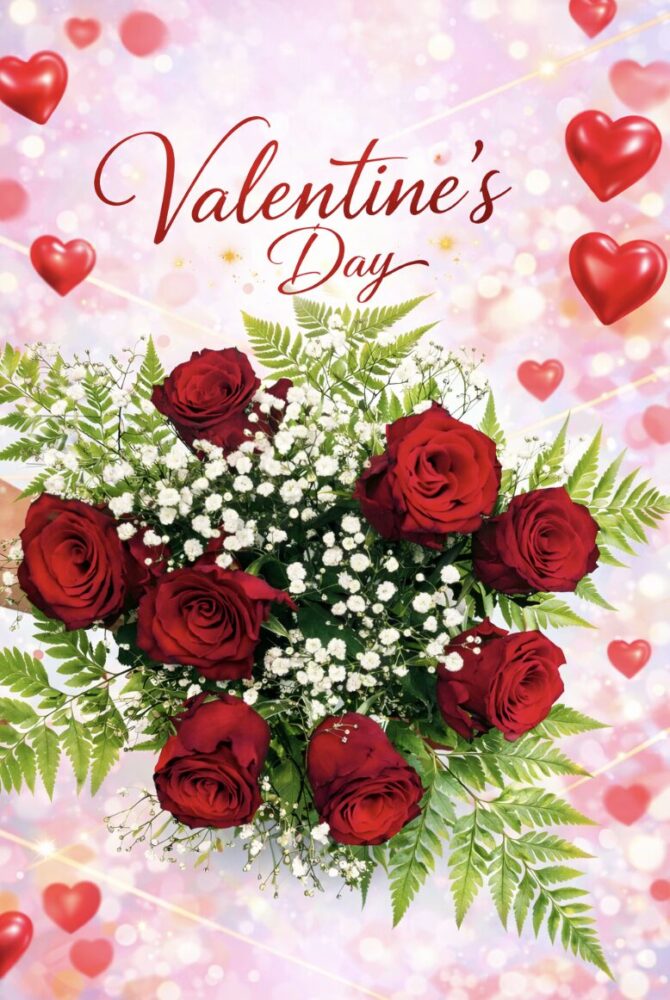 Bouquet composé de 8 roses avec gypsophiles et feuillages