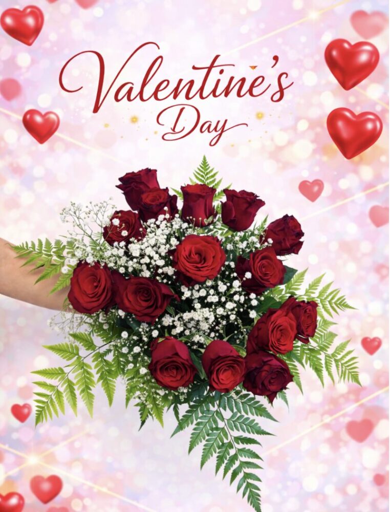 Bouquet composé de 15 roses avec gypsophiles et feuillages